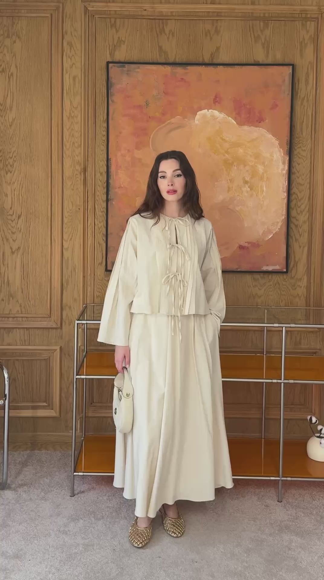 This linen set stands out with its pintuck details and front-tie design, offering a refined and distinctive style. Its natural texture ensures comfort, while the modern cut delivers an effortlessly contemporary look.